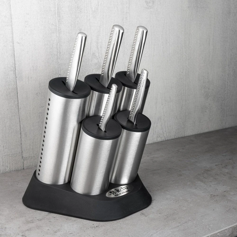 Keep your favourite cooking knives on hand at all times and in plain view whenever you need them with this beautiful Global NI Series 6 Piece Engine Knife Block Set.