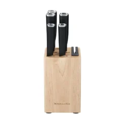 This KitchenAid five-piece knife block set includes all the essentials for everyday food prep tasks like trimming meat, chopping vegetables and slicing bread. The knives are expertly crafted using semi-polished, high-carbon Japanese steel, hardened and tempered to provide a long-lasting edge for a professional, quality cut every time. The eastern-style ergonomic handles provide optimal control for everyday use. The knives slot neatly into an attractive birchwood knife block, which features a built-in knife sharpener so you can hone your knives with every use.