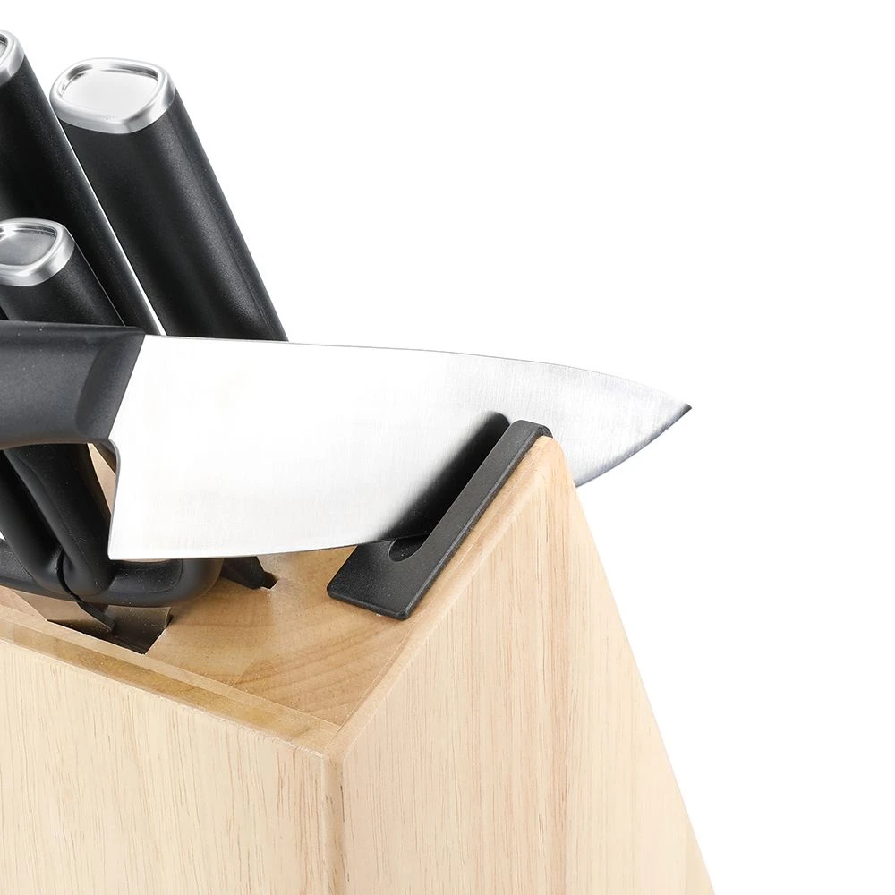 The KitchenAid Classic knife set includes all the essential knives needed to perform everyday food prep tasks. Each blade is expertly crafted using high-carbon Japanese steel for a professional, quality cut every time. Constructed for excellent stability and control, the handles are well-balanced and feature a textured finished for a secure, comfortable grip. The contemporary rubberwood storage block features a built-in sharpener for effortless sharpening and complements any kitchen. Lifetime Limited Warranty.