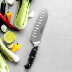 The KitchenAid santoku knife is a must-have for everyday meal prep. The ridges on the blade are specially designed to prevent foods from sticking while you slice, making it ideal for chopping and dicing vegetables. This forged knife is expertly crafted using semi-polished, high-carbon Japanese steel, hardened and tempered to provide a long-lasting edge for a professional, quality cut every time. This KitchenAid knife features an eastern-style ergonomic handle with a triple-riveted pin design that provides optimal control for everyday use. This handle is expertly engineered with a textured finish for a comfortable grip and accented with a stainless steel endcap. Includes a custom-fit blade cover for secure, safe storage. KitchenAid knives are top rack dishwasher safe. To extend the life of your knives, hand washing is recommended. Dry immediately.