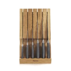 The Professional Angle Oak knife block set provides a contemporary solution to kitchen knife storage. The solid oak block features a vertically angled and space saving design, organising your kitchen workspace whilst protecting knife blade edges. This set comprises an Angle Oak knife block and 6 Professional kitchen knives.