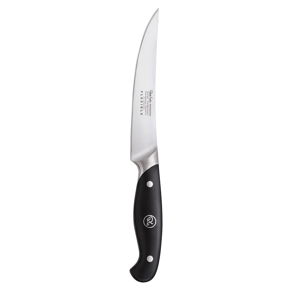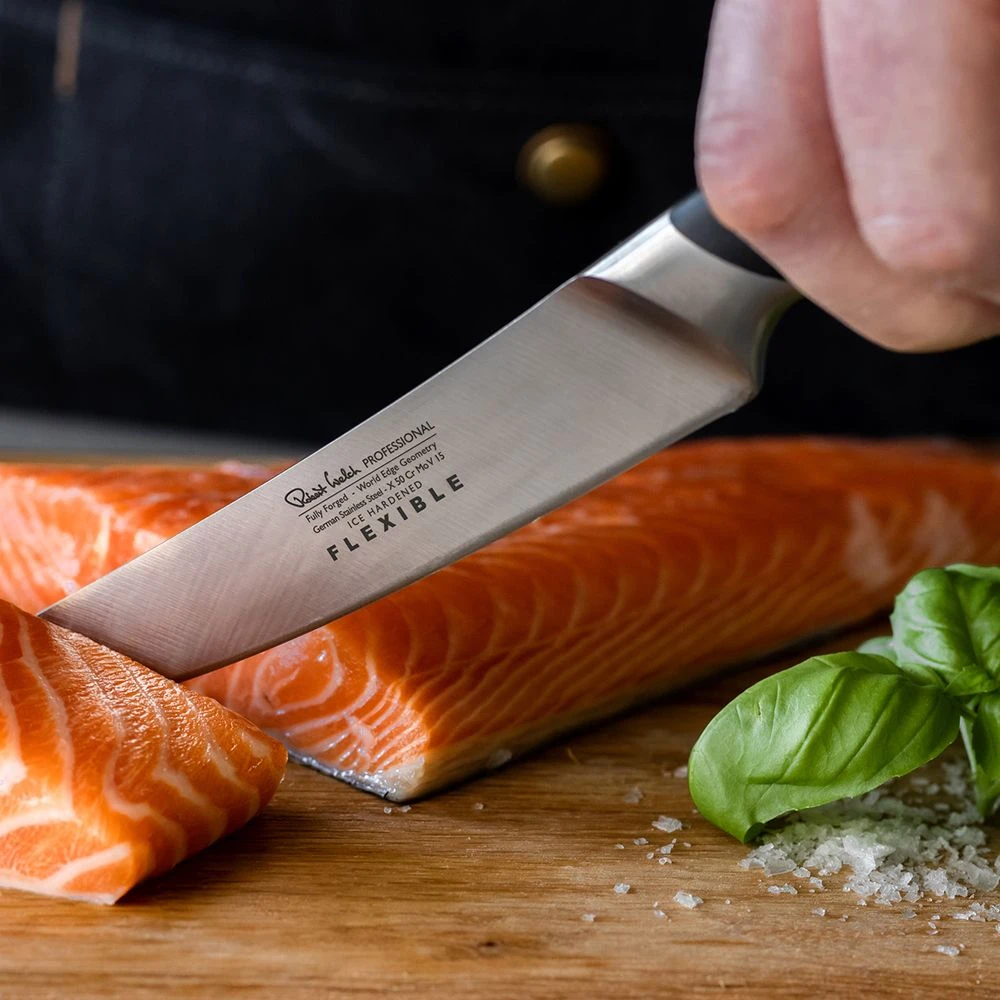 The precision sharpened Professional 16cm/6.5″ flexible utility knife has a flexible blade, for skinning and filleting fish or boning and carving meat and poultry. The added flexibility ensures ease of handling around the bone, and makes more precise cuts to help reduce any damage to delicate flesh.