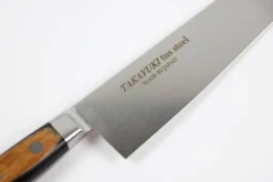 The chrome molybdenum blade, the notorious Takayuki logo and the two tone handle, give this Sakai Takayuki TUS Steel 240mm Gyuto Knife it’s own identity.