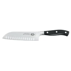 This fully forged Victorinox Santoku knife has a fluted blade, which creates small air pockets between your edge of the knife and the food, ensuring that the thinnest cuts do not stick to the knife. The perfectly weighted balance of the blade and handle make the Santoku comfortable to control, and offers high precision when slicing, dicing and mincing which the knives are ideally designed for.